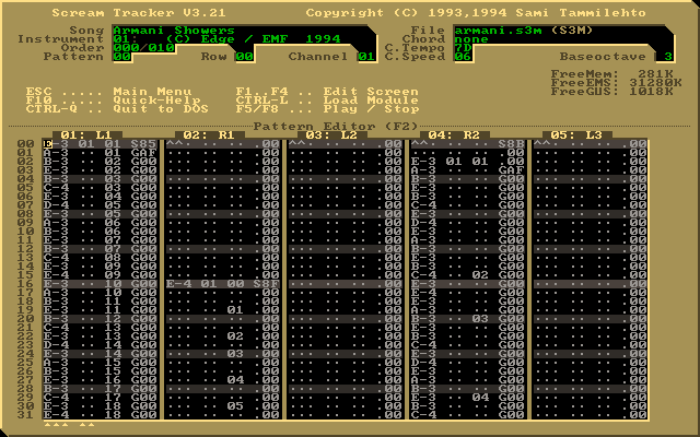 I grew up in the Scream Tracker era where you could fill patterns with notes that play samples to build up a song, with columns that define volume / effects / speed etc: